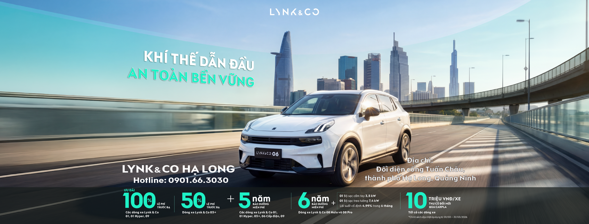 🚗 KHÍ THẾ DẪN ĐẦU – AN TOÀN BỀN VỮNG: ƯU ĐÃI ĐẶC BIỆT TRONG THÁNG 3 CỦA LYNK & CO HẠ LONG ✨ Tháng 3 mở ra một lời chào hứa hẹn với những dự định mới, những trải nghiệm mới. Khi những kế hoạch đặt ra đầu năm bắt đầu khởi động, mỗi chuyến đi cũng trở thành một phần của hành trình khám phá, làm việc và tận hưởng cuộc sống theo cách riêng. Trong tháng mới, Lynk & Co Hạ Long mang đến chương trình ưu đ