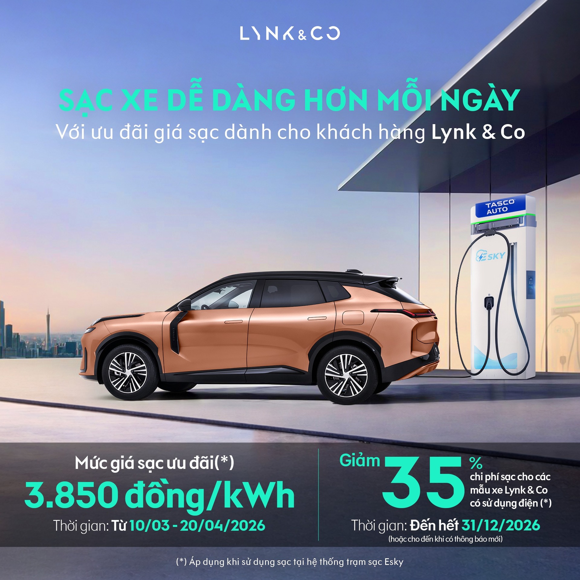 ⚡ SẠC XE DỄ DÀNG HƠN VỚI ƯU ĐÃI SẠC ĐIỆN DÀNH CHO KHÁCH HÀNG LYNK & CO ⚡ Nhằm mở rộng hệ sinh thái năng lượng và mang đến thêm lựa chọn sạc thuận tiện cho khách hàng, Lynk & Co Việt Nam phối hợp cùng Esky triển khai chương trình ưu đãi sạc dành riêng cho các chủ xe Lynk & Co. Thông qua chương trình, khách hàng Lynk & Co được hưởng các ưu đãi nổi bật khi sử dụng hệ thống trạm sạc thuộc mạng lưới Es